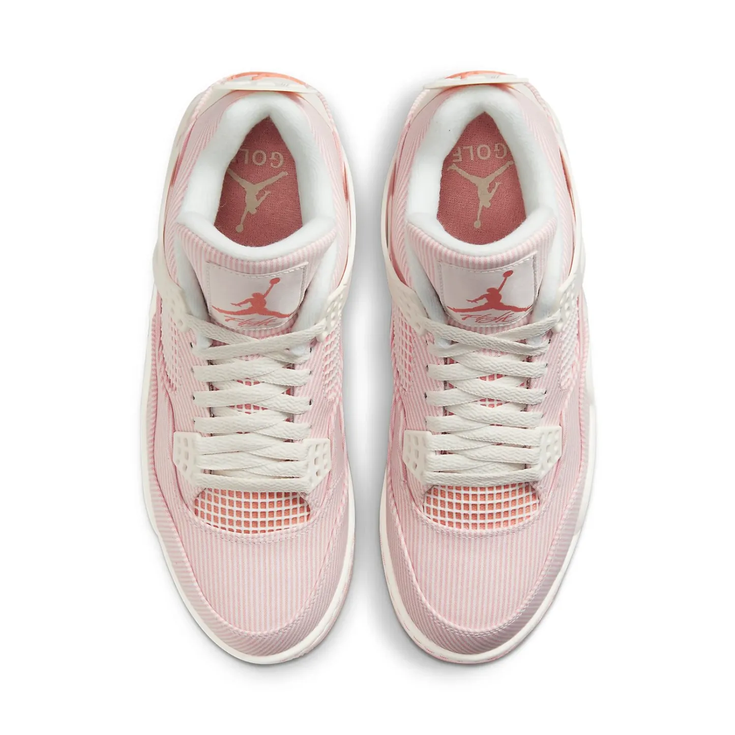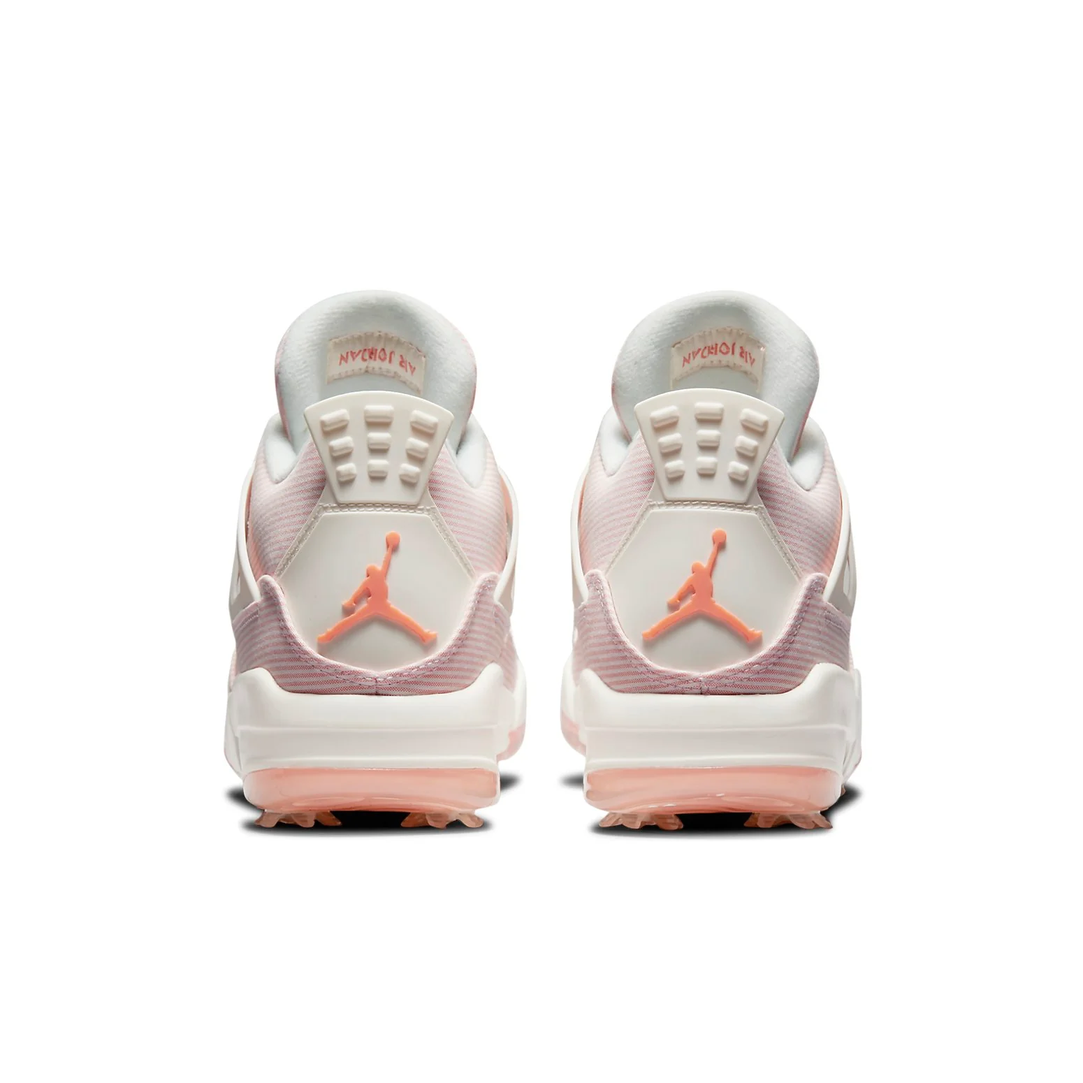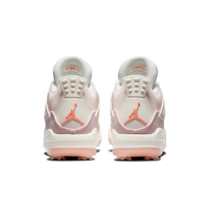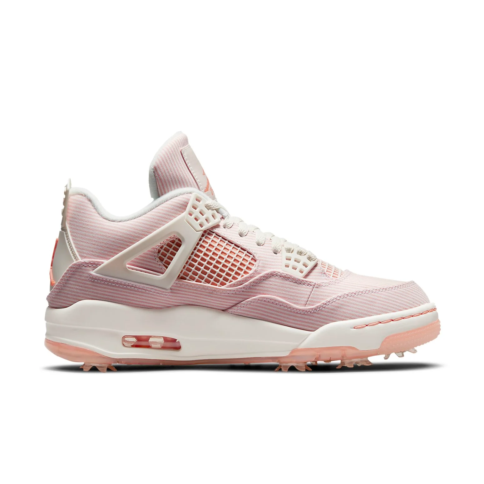 Air Jordan 4 Golf 'Apricot Agate' is a summer-ready sneaker that is perfect for hitting the greens. This sneaker features a seersucker upper in white and pink stripes. The Off-white Sail is applied to the sneaker’s molded eyelets, structural wings and stitched heel tab, the latter featuring a raised Jumpman logo in Apricot Agate. The sneaker sits on a foam midsole fitted with a visible Air-sole unit in the heel, and supported by a translucent outsole plate with removable spikes for optimal traction. Air Jordan 4 Golf 'Apricot Agate' is sure to turn heads when worn on or off the golf course.